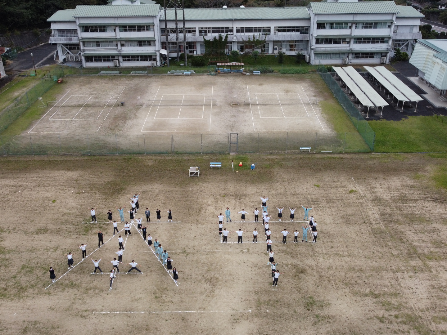 測量で描いた本中という文字をドローンで撮影しました。